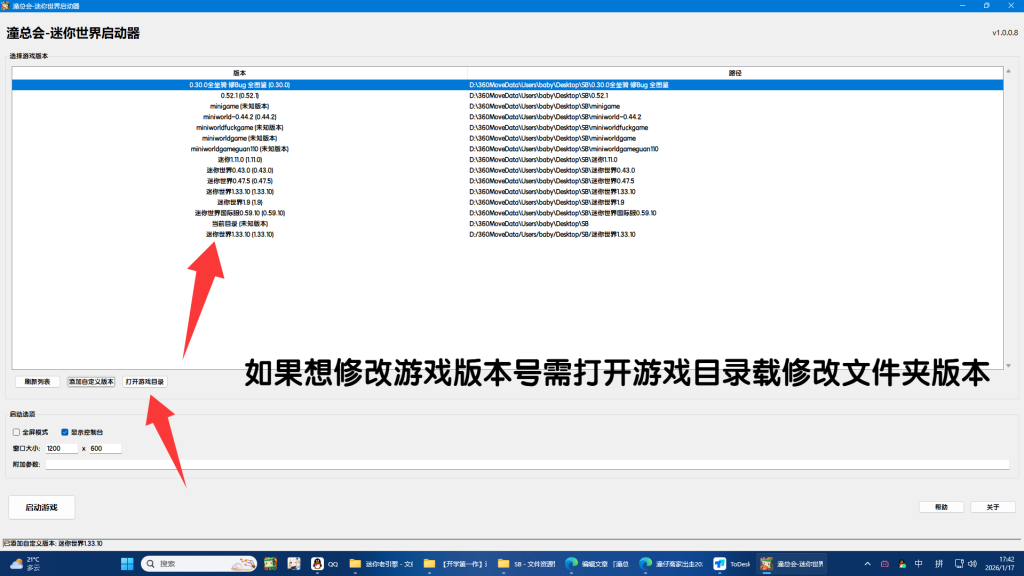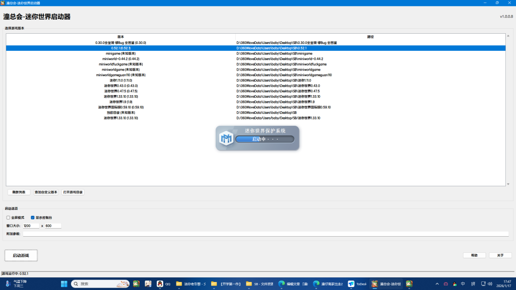 潼总会迷你世界启动器1.1.8.7 了解潼总会启动器 潼总会启动器起源于2025年8月31日,是一款能启动迷你世界所有版本的“万能钥匙”,可由于初 在线下载 正在获取... 发布: 2026年1月17日 更新: 2026年1月27日 下载: 8 浏览: 30 文件格式: exe 操作系统: Windows 文件大小: 10.8MB 0 点赞 0 收藏 0 评论 本文标题:潼总会迷你世界启动器1.1.8.7 本文链接:https://hxblog.lyti.top/3539.html 版权声明:本站文章除特别声明外,均采用 CC BY-NC-SA 4.0 许可协议,转载请注明出处! 了解潼总会启动器 潼总会启动器起源于2025年8月31日,是一款能启动迷你世界所有版本的“万能钥匙”,可由于初代启动器版本为bat脚本制作,功能单一,且需要个人修改,bat文件明显不适应需要,而在2026年1月16日,利用Python制成了一个exe文件,期间历时2小时修改53次,最终形成了一个可启动所有版本的迷你,且支持添加自定义版本,无需改目录和个性化游戏内容,甚至启动命令 新版UI界面 使用方法(旧版和新版的方法是一样的) 使用前请将启动器放置游戏目录,然后运行启动器,你也可以添加自定义版本 Step1 点击“添加自定义版本” Step2 选择迷你世界带有”iworldpc.exe/minigameapp.exe/iworldpc3.exe”文件然后点击选择文件夹,系统会自动识别,如果文件夹没写版本号为未知版本,需要自己写版本号,你还可以点击“打开游戏目录”来定位游戏版本文件夹 Step3 选择迷你世界版本,然后点击启动游戏,系统将自动打开游戏“由于渠道问题,否则启动到可登录渠道” 启动器前代版本 启动器现在版本 常见问题 1.Q:游戏无法启动怎么办? A: 检查游戏文件是否完整 2.Q:版本检测出现问题了? A:点击刷新列表重新检测 3.Q:游戏启动失败了,有可能显示“初始化出错,请重新下载安装客户端” A:重装游戏即可解决 Bug报告 由于启动器仍未完善,可能会出现“渠道不正导致篡改sence图片”或者”新引擎无法启动”的问题,如果遇到了,请及时上报bug,作者会第一时间处理 Bug1 如果解决此问题,请到当前游戏目录下的pluginres中的sence.jpg更换,然后勾上只读 Step1 Step2 Bug2 该问题如果是新引擎版本,需要安装启动框架,该框架作者正在开发中 下载资源 免费 文件格式: exe 操作系统: Windows 文件大小: 10.8MB 下载: 8次 评论 暂无评论 取消回复 评论内容 * 发表评论